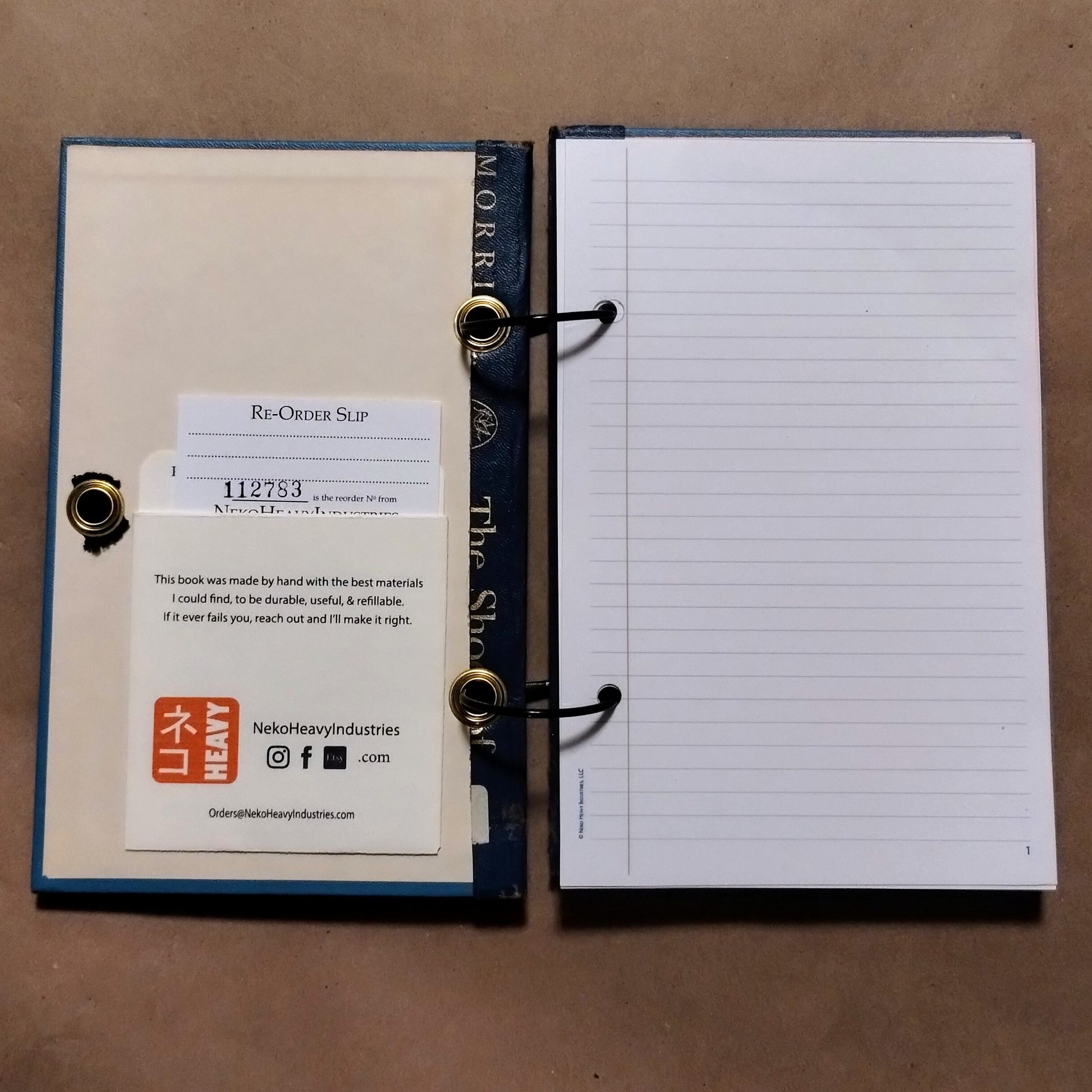 This lined journal crafted from a vintage book is filled with premium, artist-grade paper, custom designed to compliment its covers. The single-sided print allows for full-width blank or lined spreads, perfect for illustrations, diagrams and free thought. The openable binding made of nylon-coated, braided stainless steel won't open unless you want it to and allows pages to be re-ordered and refilled. Secure, elastic closure keeps your drawings and writing safe.
