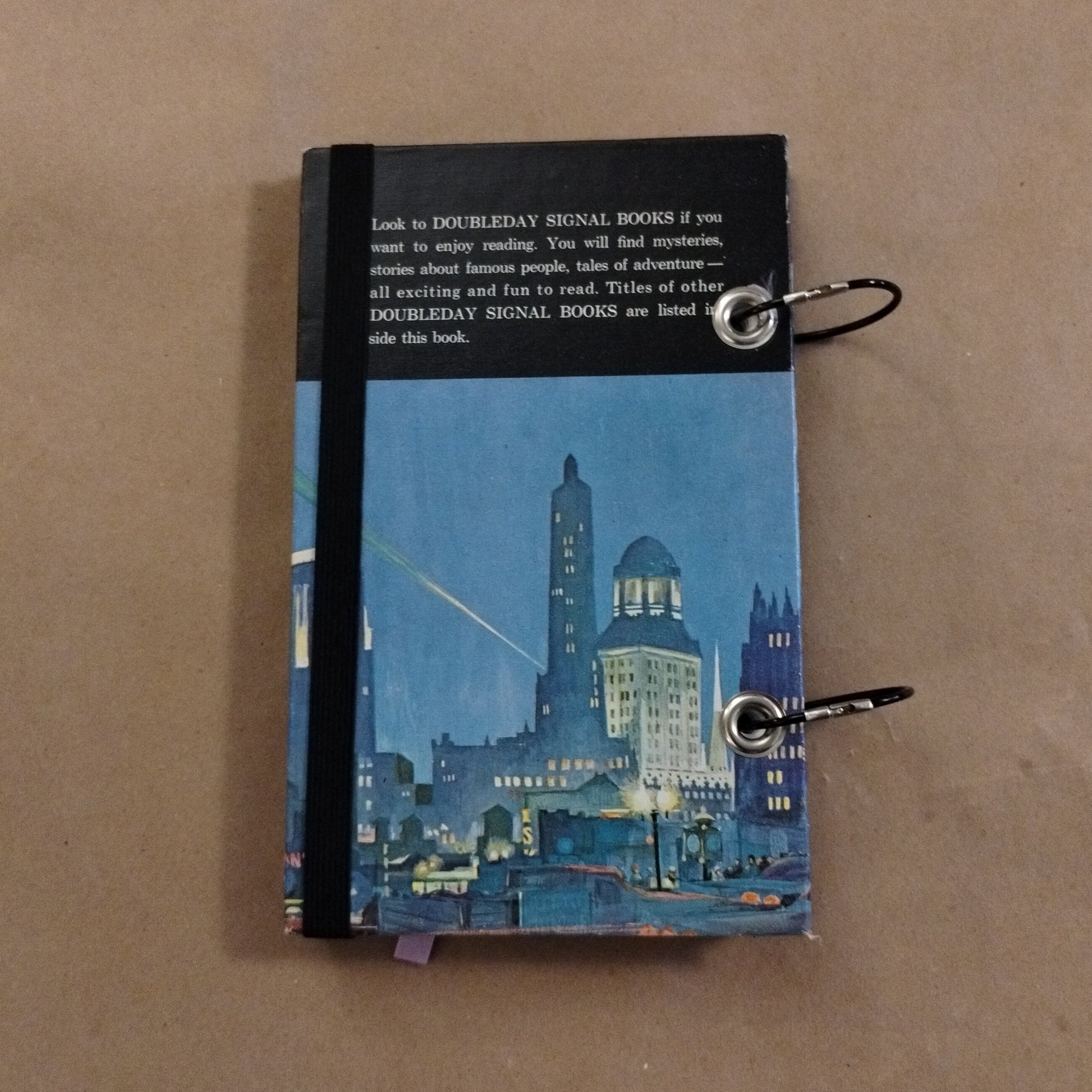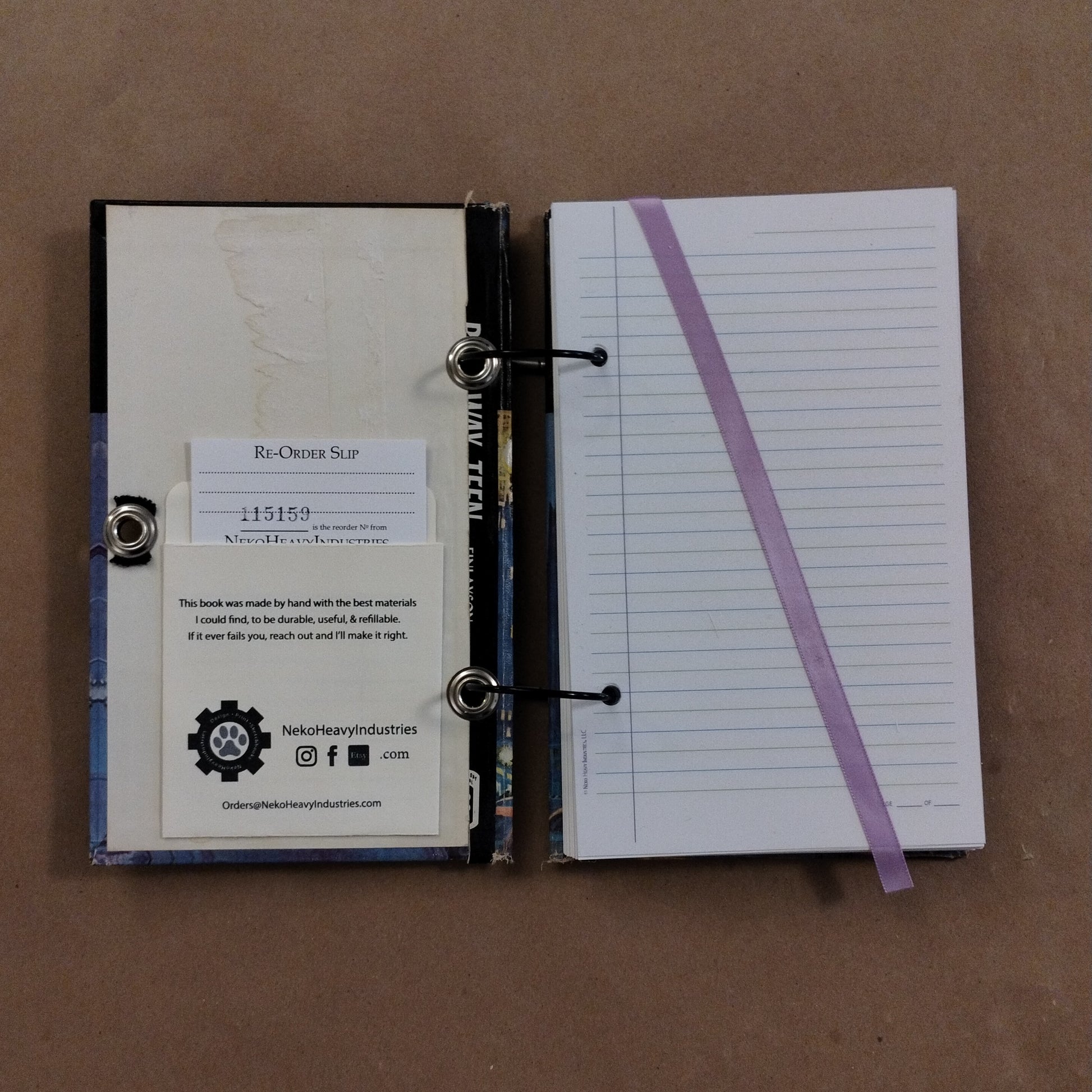 This lined journal crafted from a vintage book is filled with premium, artist-grade paper, custom designed to compliment its covers. The single-sided print allows for full-width blank or lined spreads, perfect for illustrations, diagrams and free thought. The openable binding made of nylon-coated, braided stainless steel won't open unless you want it to and allows pages to be re-ordered and refilled. Secure, elastic closure keeps your drawings and writing safe.