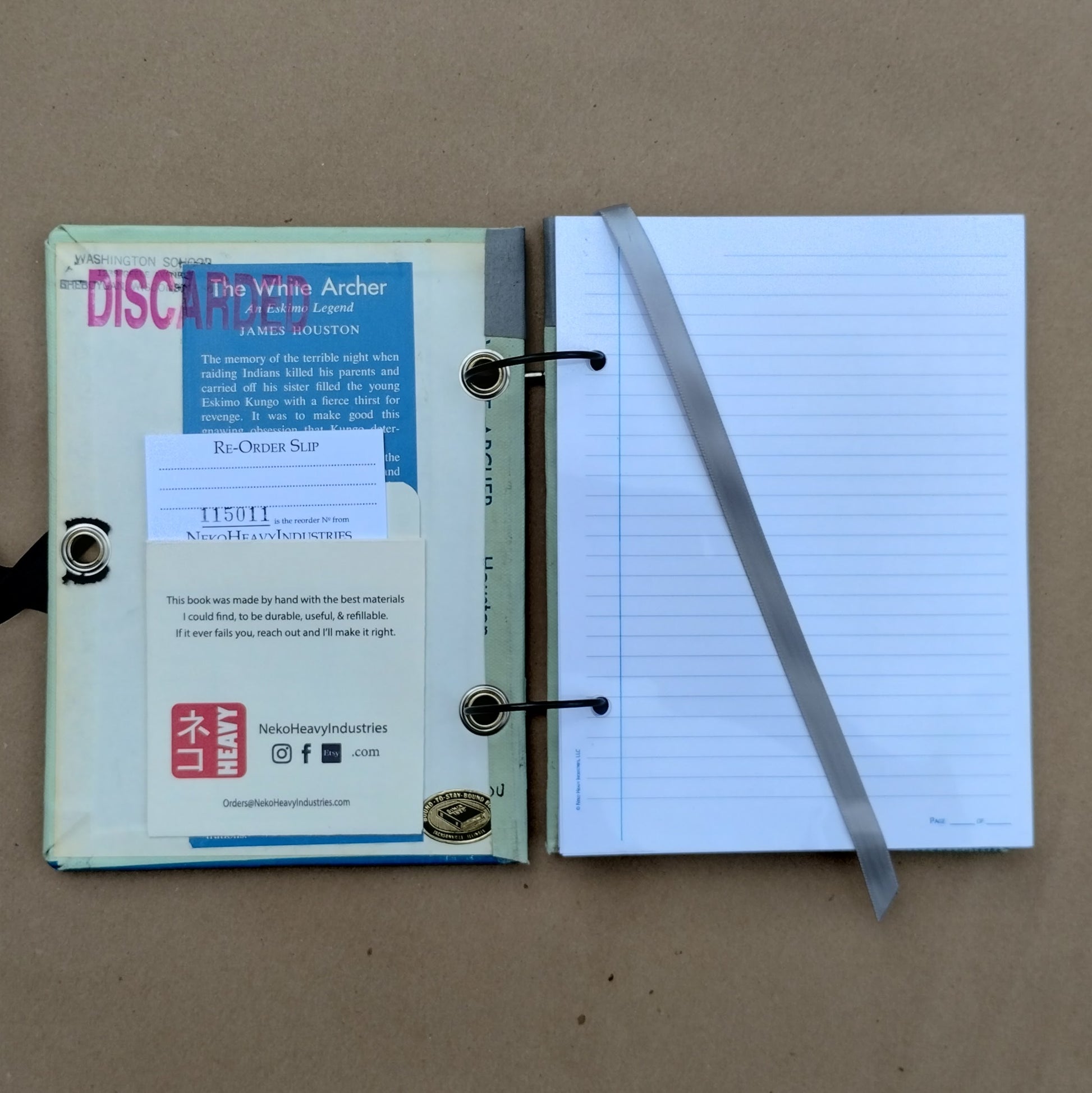 This lined journal crafted from a vintage book is filled with premium, artist-grade paper, custom designed to compliment its covers. The single-sided print allows for full-width blank or lined spreads, perfect for illustrations, diagrams and free thought. The openable binding made of nylon-coated, braided stainless steel won't open unless you want it to and allows pages to be re-ordered and refilled. Secure, elastic closure keeps your drawings and writing safe.